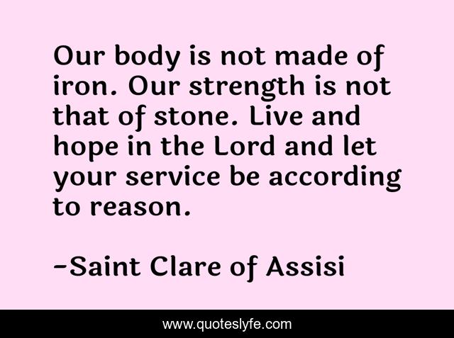 This page presents the quote "Our body is not made of iron. Our strength is not that of stone. Live and hope in the Lord and let your service be according to reason.". Author of this quote is Saint Clare of Assisi. This quote is about faith, unity,.