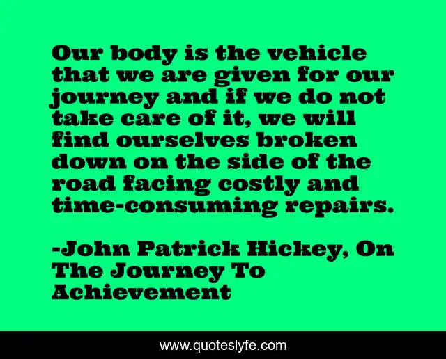 This page presents the quote "Our body is the vehicle that we are given for our journey and if we do not take care of it, we will find ourselves broken down on the side of the road facing costly and time-consuming repairs.". Author of this quote is John Patrick Hickey, On The Journey To Achievement. This quote is about personal-development, achievement, goal-setting, success, goals,.
