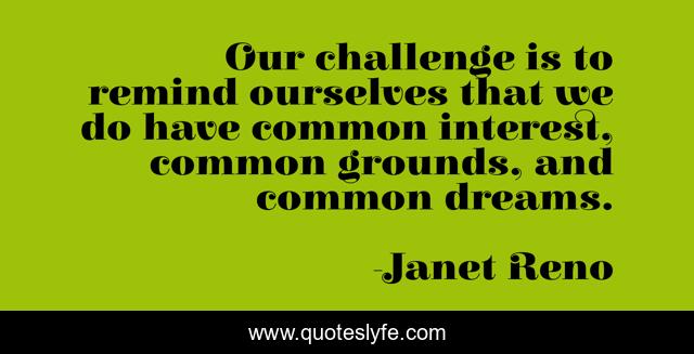 This page presents the quote "Our challenge is to remind ourselves that we do have common interest, common grounds, and common dreams.". Author of this quote is Janet Reno. This quote is about challenge, common, interest,.
