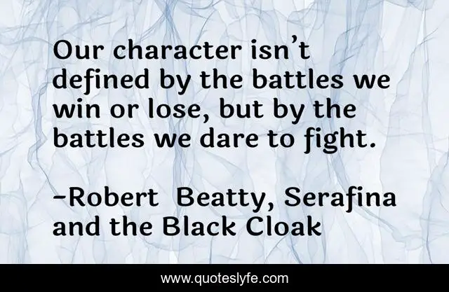 This page presents the quote "Our character isn’t defined by the battles we win or lose, but by the battles we dare to fight.". Author of this quote is Robert Beatty, Serafina and the Black Cloak. This quote is about serafina-and-the-black-cloak, angel, graveyard, robert-beatty,.