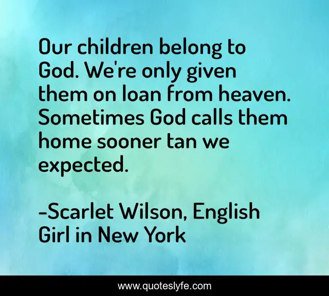 This page presents the quote "Our children belong to God. We're only given them on loan from heaven. Sometimes God calls them home sooner tan we expected.". Author of this quote is Scarlet Wilson, English Girl in New York. This quote is about enthusiasm, death, children, inspirational, hope,.