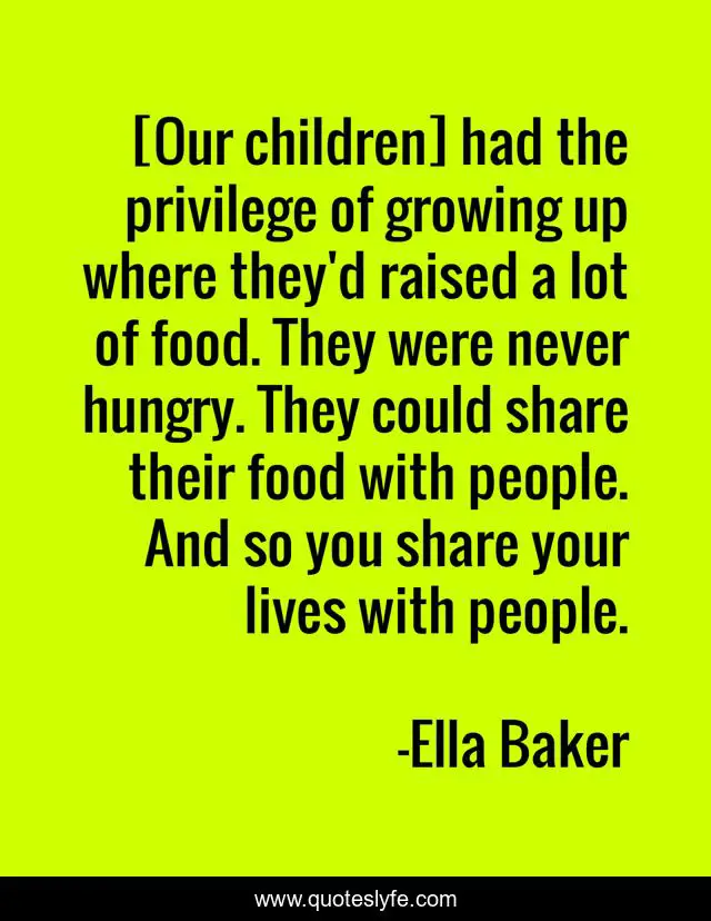 This page presents the quote "[Our children] had the privilege of growing up where they'd raised a lot of food. They were never hungry. They could share their food with people. And so you share your lives with people.". Author of this quote is Ella Baker. This quote is about helping, people,.