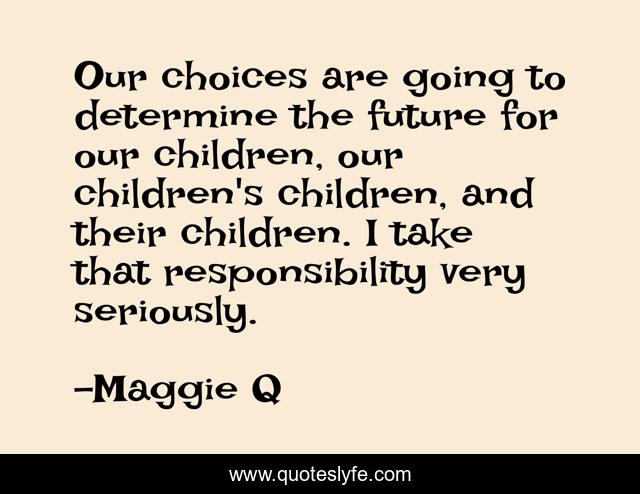 This page presents the quote "Our choices are going to determine the future for our children, our children's children, and their children. I take that responsibility very seriously.". Author of this quote is Maggie Q. This quote is about responsibility, children,.
