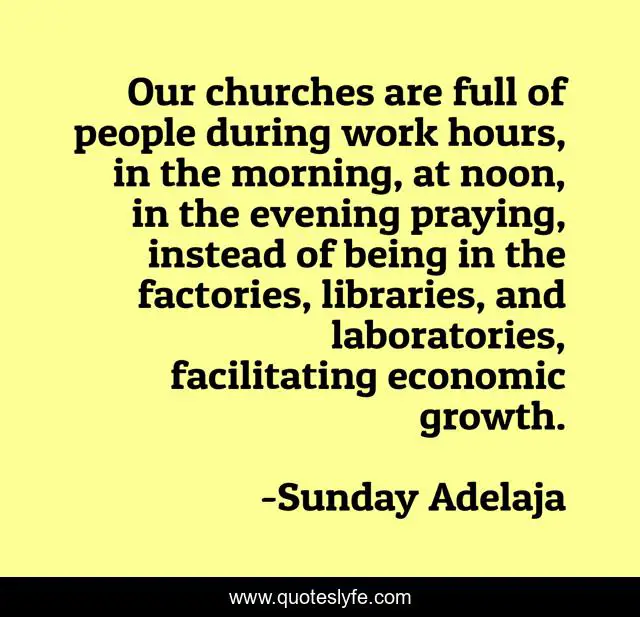 This page presents the quote "Our churches are full of people during work hours, in the morning, at noon, in the evening praying, instead of being in the factories, libraries, and laboratories, facilitating economic growth.". Author of this quote is Sunday Adelaja. This quote is about growth, church,.