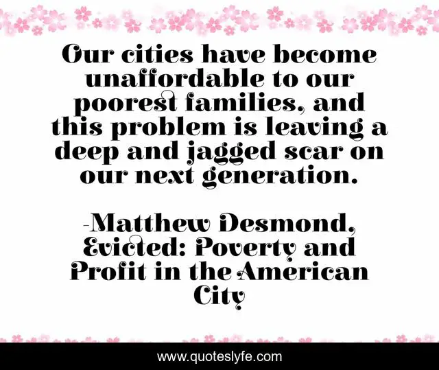 This page presents the quote "Our cities have become unaffordable to our poorest families, and this problem is leaving a deep and jagged scar on our next generation.". Author of this quote is Matthew Desmond, Evicted: Poverty and Profit in the American City. This quote is about eviction, poverty,.