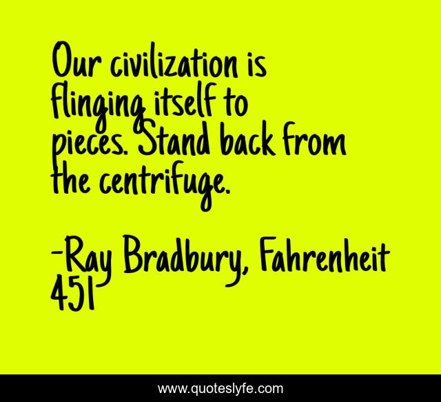 This page presents the quote "Our civilization is flinging itself to pieces. Stand back from the centrifuge.". Author of this quote is Ray Bradbury, Fahrenheit 451. .