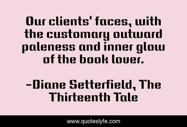 This page presents the quote "Our clients' faces, with the customary outward paleness and inner glow of the book lover.". Author of this quote is Diane Setterfield, The Thirteenth Tale. .