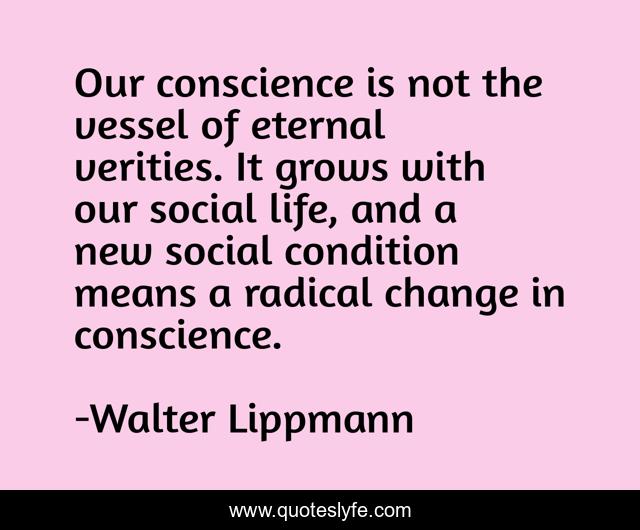 This page presents the quote "Our conscience is not the vessel of eternal verities. It grows with our social life, and a new social condition means a radical change in conscience.". Author of this quote is Walter Lippmann. This quote is about conscience, new, life,.