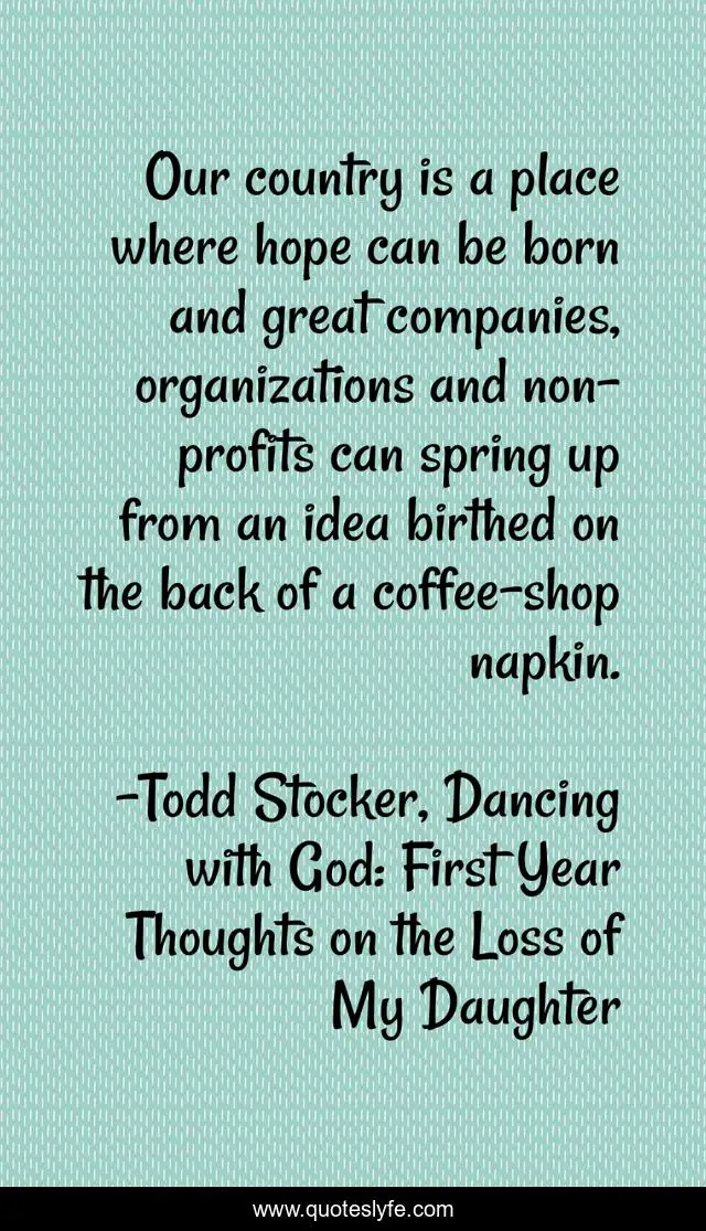 This page presents the quote "Our country is a place where hope can be born and great companies, organizations and non-profits can spring up from an idea birthed on the back of a coffee-shop napkin.". Author of this quote is Todd Stocker, Dancing with God: First Year Thoughts on the Loss of My Daughter. This quote is about coffee, business, innovation, excellence, greatness, america, integrity, hope,.