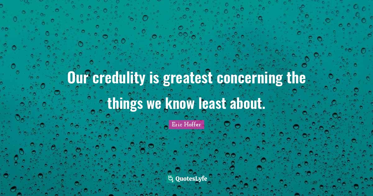 This page presents the quote "Our credulity is greatest concerning the things we know least about.". Author of this quote is Eric Hoffer. This quote is about knows, calumny is, gullibility, credulity,.