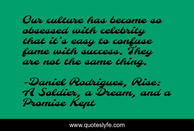 This page presents the quote "Our culture has become so obsessed with celebrity that it’s easy to confuse fame with success. They are not the same thing.". Author of this quote is Daniel Rodriguez, Rise: A Soldier, a Dream, and a Promise Kept. This quote is about army, football, sports, inspirational, enthusiasm, military, celebrity-culture, war,.