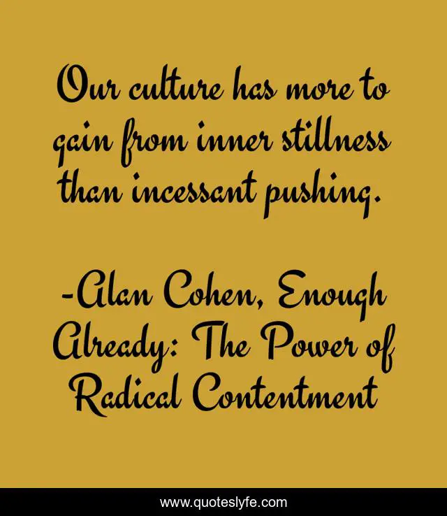 This page presents the quote "Our culture has more to gain from inner stillness than incessant pushing.". Author of this quote is Alan Cohen, Enough Already: The Power of Radical Contentment. This quote is about buddism, enthusiasm, inner-stillness, inspirational, spirituality,.
