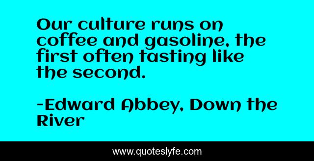 This page presents the quote "Our culture runs on coffee and gasoline, the first often tasting like the second.". Author of this quote is Edward Abbey, Down the River. This quote is about culture, coffee, gasoline,.
