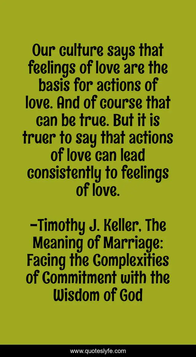 This page presents the quote "Our culture says that feelings of love are the basis for actions of love. And of course that can be true. But it is truer to say that actions of love can lead consistently to feelings of love.". Author of this quote is Timothy J. Keller, The Meaning of Marriage: Facing the Complexities of Commitment with the Wisdom of God. This quote is about love, marriage, affection,.