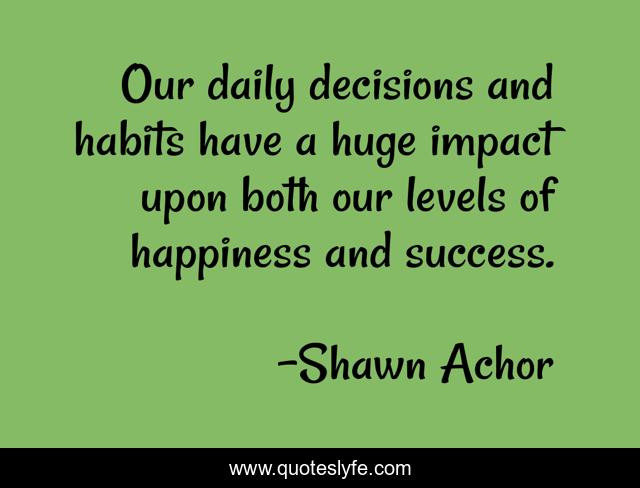 This page presents the quote "Our daily decisions and habits have a huge impact upon both our levels of happiness and success.". Author of this quote is Shawn Achor. This quote is about decisions, success, daily,.