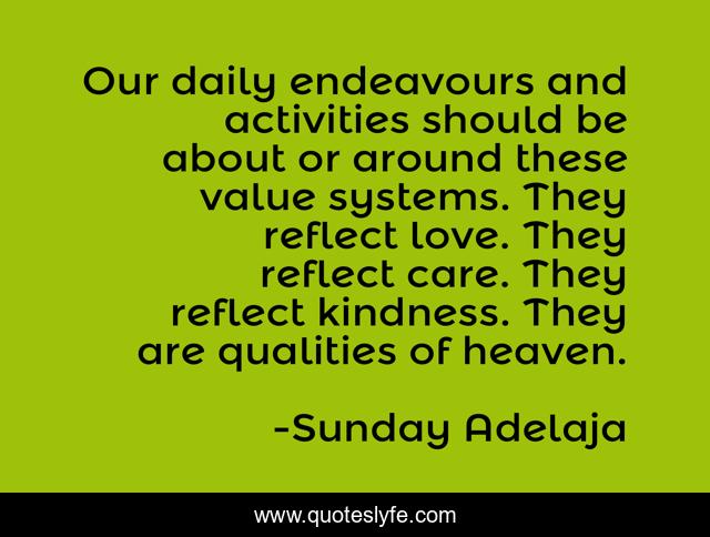 This page presents the quote "Our daily endeavours and activities should be about or around these value systems. They reflect love. They reflect care. They reflect kindness. They are qualities of heaven.". Author of this quote is Sunday Adelaja. This quote is about activities, heaven, endeavour, values, love, kindness, affection, care,.