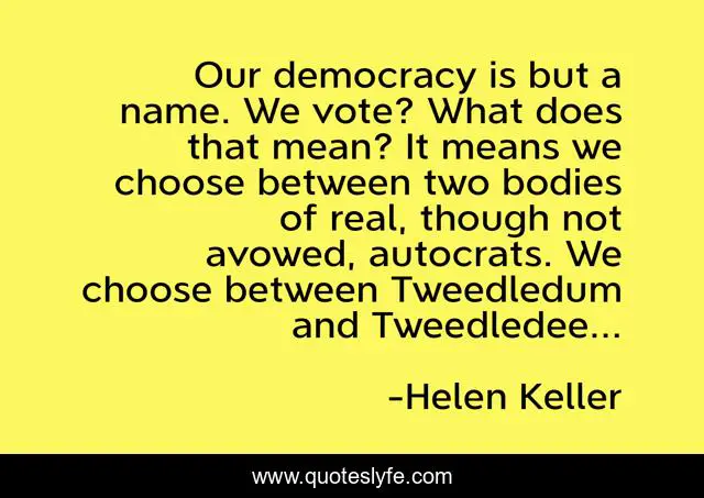 This page presents the quote "Our democracy is but a name. We vote? What does that mean? It means we choose between two bodies of real, though not avowed, autocrats. We choose between Tweedledum and Tweedledee...". Author of this quote is Helen Keller. This quote is about politics, helen-keller,.