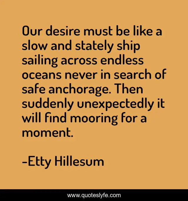 This page presents the quote "Our desire must be like a slow and stately ship sailing across endless oceans never in search of safe anchorage. Then suddenly unexpectedly it will find mooring for a moment.". Author of this quote is Etty Hillesum. This quote is about , pressure, diamonds,.