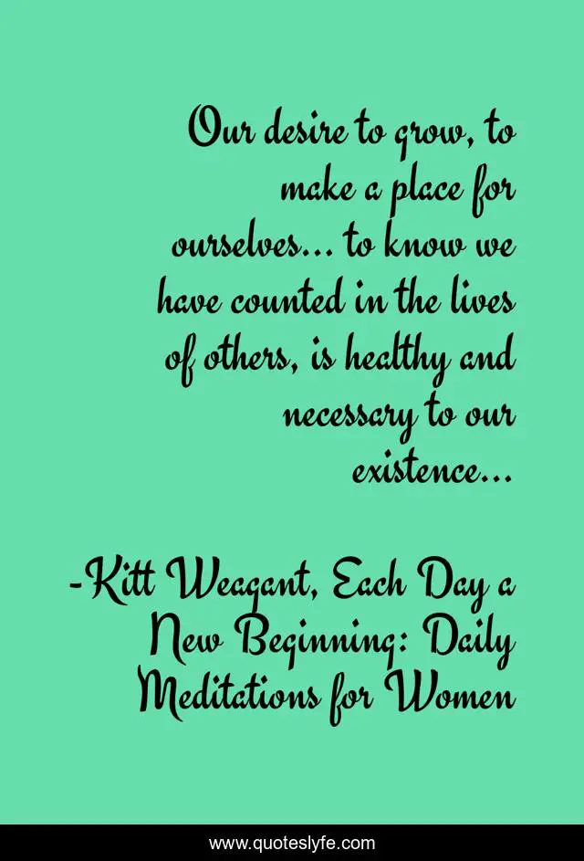 This page presents the quote "Our desire to grow, to make a place for ourselves… to know we have counted in the lives of others, is healthy and necessary to our existence…". Author of this quote is Kitt Weagant, Each Day a New Beginning: Daily Meditations for Women. This quote is about motivation, growth, inspiration,.