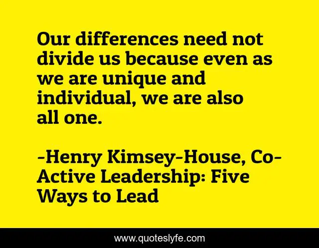 This page presents the quote "Our differences need not divide us because even as we are unique and individual, we are also all one.". Author of this quote is Henry Kimsey-House, Co-Active Leadership: Five Ways to Lead. This quote is about division, differences, unity, individual, leadership, unique,.