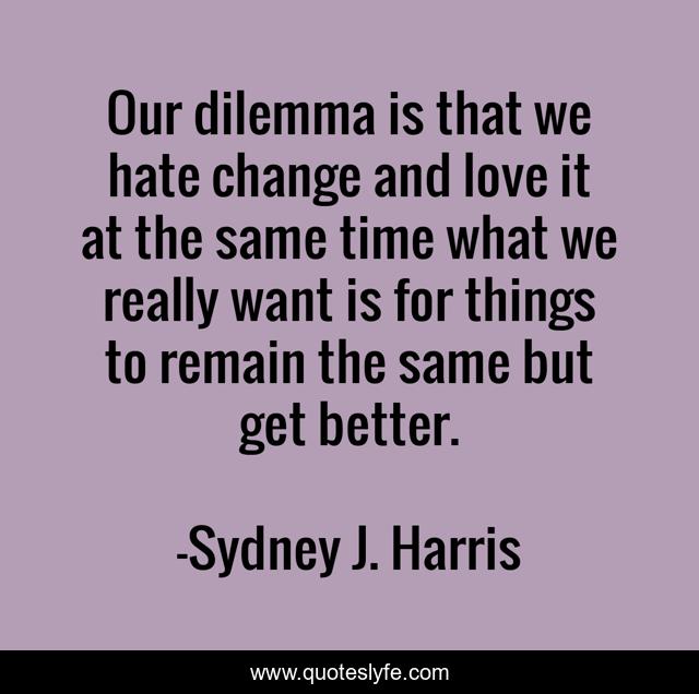 This page presents the quote "Our dilemma is that we hate change and love it at the same time what we really want is for things to remain the same but get better.". Author of this quote is Sydney J. Harris. This quote is about love, hate, affection, time,.