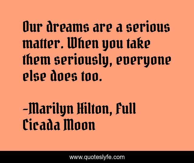 This page presents the quote "Our dreams are a serious matter. When you take them seriously, everyone else does too.". Author of this quote is Marilyn Hilton, Full Cicada Moon. .