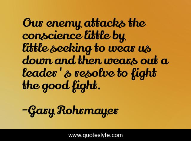 This page presents the quote "Our enemy attacks the conscience little by little seeking to wear us down and then wears out a leader's resolve to fight the good fight.". Author of this quote is Gary Rohrmayer. This quote is about conscience, church-leaders, devil, church-planters, resolve, satan, leadership, resilience, pastoral-ministry,.