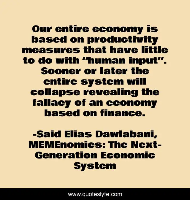 This page presents the quote "Our entire economy is based on productivity measures that have little to do with “human input”. Sooner or later the entire system will collapse revealing the fallacy of an economy based on finance.". Author of this quote is Said Elias Dawlabani, MEMEnomics: The Next-Generation Economic System. This quote is about human-input, finance, economy,.
