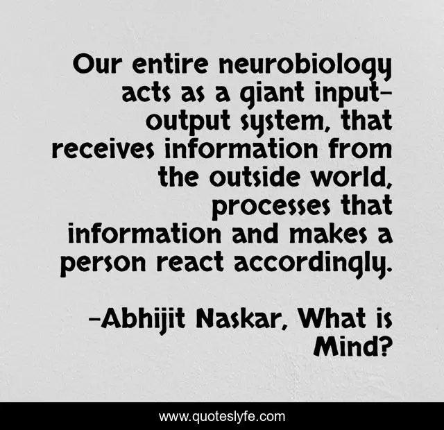 This page presents the quote "Our entire neurobiology acts as a giant input-output system, that receives information from the outside world, processes that information and makes a person react accordingly.". Author of this quote is Abhijit Naskar, What is Mind?. This quote is about reflection-on-life, neurobiology, wisdom, philosophy-of-mind, reflection-of-your-mind, science-of-mind, thought-provoking, neuroscience, philosophy-of-science,.