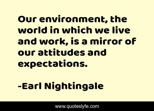 This page presents the quote "Our environment, the world in which we live and work, is a mirror of our attitudes and expectations.". Author of this quote is Earl Nightingale. This quote is about world, work, mirror,.