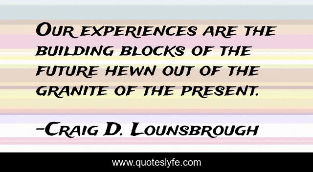 This page presents the quote "Our experiences are the building blocks of the future hewn out of the granite of the present.". Author of this quote is Craig D. Lounsbrough. This quote is about lessons, advance, blocks, maturation, maturing, shaped, past, growth, experiences,.