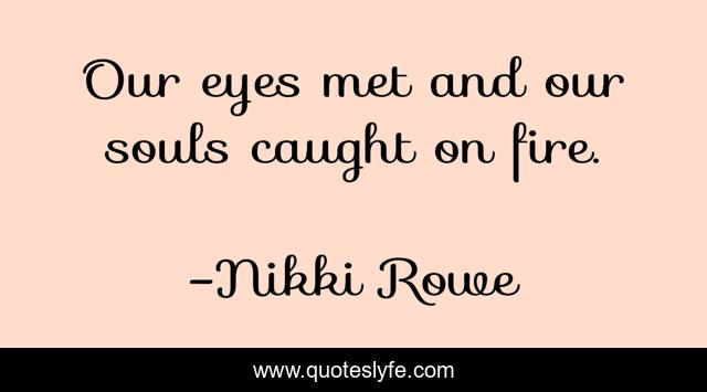 This page presents the quote "Our eyes met and our souls caught on fire.". Author of this quote is Nikki Rowe. This quote is about brave-heart, love, destiny, fate, true-flame, twin-souls, twin-flame, meant-to-be, chemistry,.