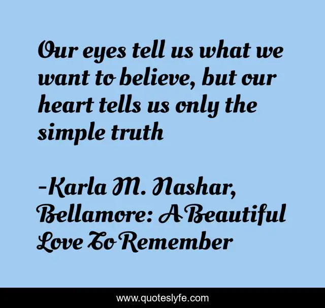 This page presents the quote "Our eyes tell us what we want to believe, but our heart tells us only the simple truth". Author of this quote is Karla M. Nashar, Bellamore: A Beautiful Love To Remember. .
