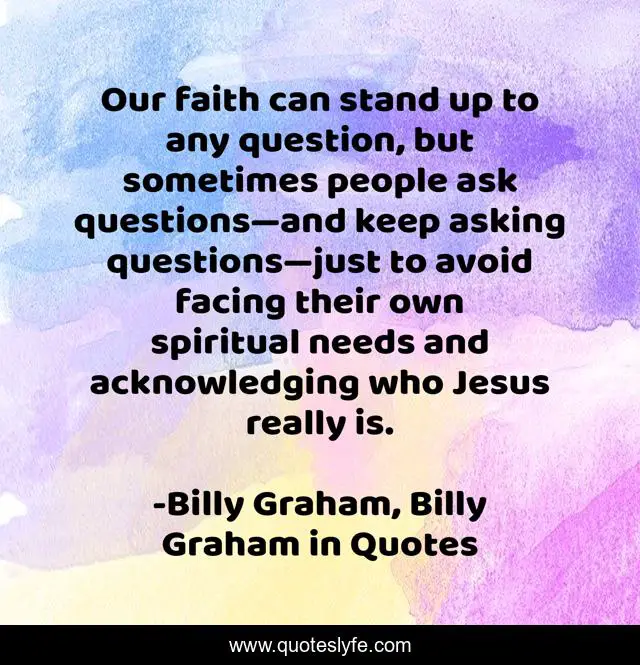 This page presents the quote "Our faith can stand up to any question, but sometimes people ask questions—and keep asking questions—just to avoid facing their own spiritual needs and acknowledging who Jesus really is.". Author of this quote is Billy Graham, Billy Graham in Quotes. This quote is about faith, billy-graham,.