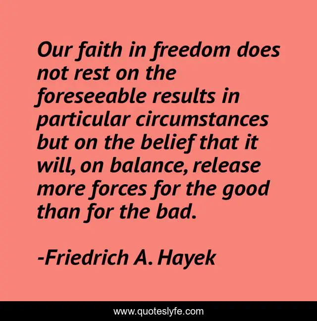 This page presents the quote "Our faith in freedom does not rest on the foreseeable results in particular circumstances but on the belief that it will, on balance, release more forces for the good than for the bad.". Author of this quote is Friedrich A. Hayek. This quote is about freedom, economics, free-market, liberty,.
