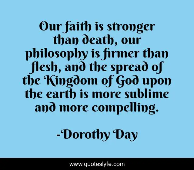 This page presents the quote "Our faith is stronger than death, our philosophy is firmer than flesh, and the spread of the Kingdom of God upon the earth is more sublime and more compelling.". Author of this quote is Dorothy Day. This quote is about faith, philosophy, god,.