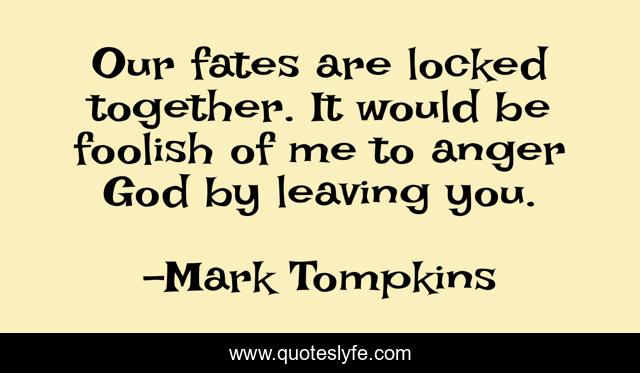 This page presents the quote "Our fates are locked together. It would be foolish of me to anger God by leaving you.". Author of this quote is Mark Tompkins. This quote is about destiny, fate, theology, kismet, last-days-of-magic, mythology, najia,.