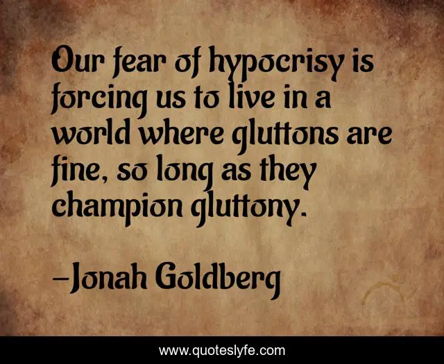 This page presents the quote "Our fear of hypocrisy is forcing us to live in a world where gluttons are fine, so long as they champion gluttony.". Author of this quote is Jonah Goldberg. This quote is about world, champion, long,.