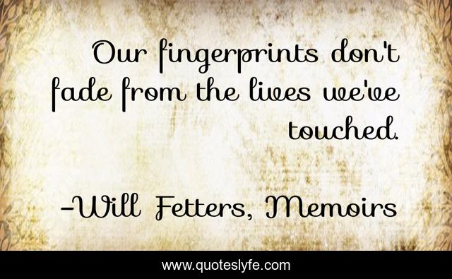 This page presents the quote "Our fingerprints don't fade from the lives we've touched.". Author of this quote is Will Fetters, Memoirs. This quote is about screenplay, enthusiasm, inspirational,.