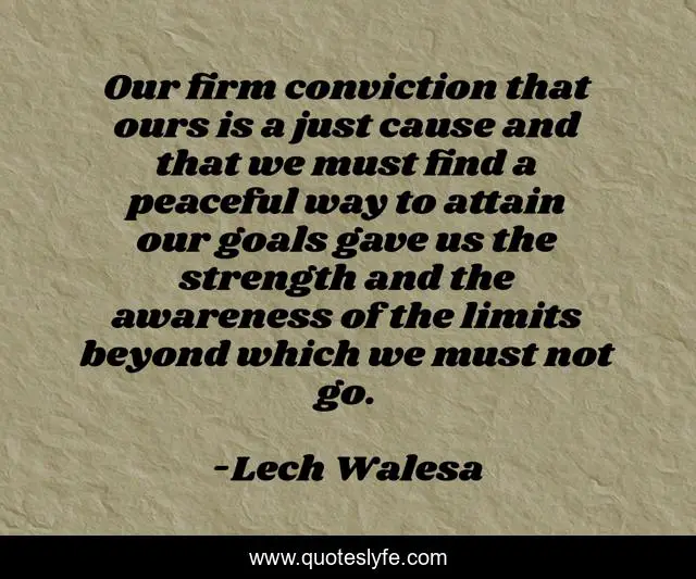 This page presents the quote "Our firm conviction that ours is a just cause and that we must find a peaceful way to attain our goals gave us the strength and the awareness of the limits beyond which we must not go.". Author of this quote is Lech Walesa. This quote is about goals, limits, peaceful,.