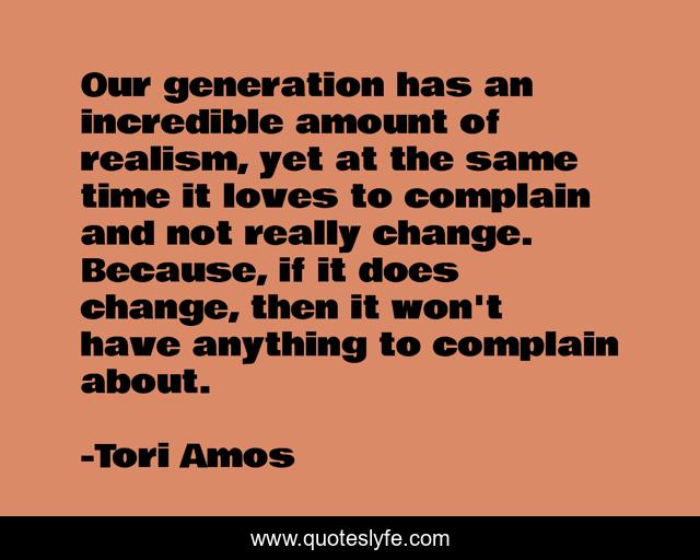 This page presents the quote "Our generation has an incredible amount of realism, yet at the same time it loves to complain and not really change. Because, if it does change, then it won't have anything to complain about.". Author of this quote is Tori Amos. This quote is about generation, complain, time,.