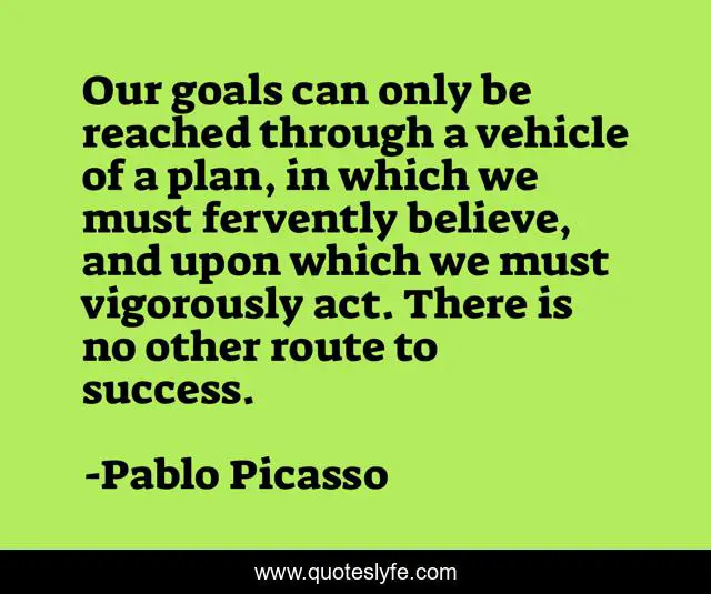 This page presents the quote "Our goals can only be reached through a vehicle of a plan, in which we must fervently believe, and upon which we must vigorously act. There is no other route to success.". Author of this quote is Pablo Picasso. This quote is about believe, goals, plan,.