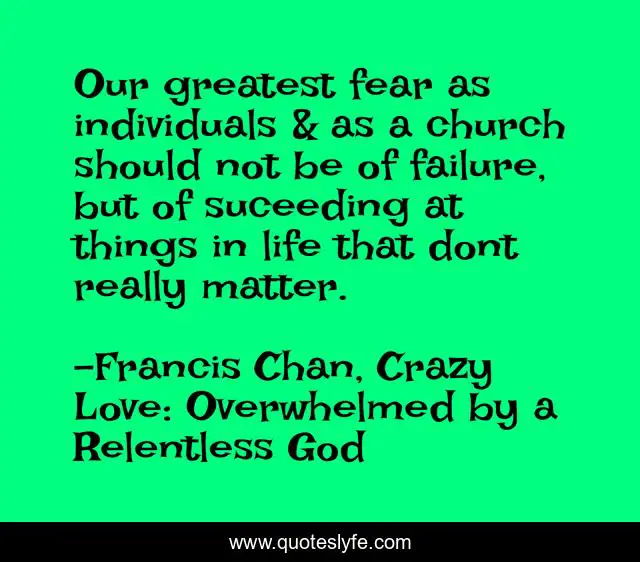 This page presents the quote "Our greatest fear as individuals & as a church should not be of failure, but of suceeding at things in life that dont really matter.". Author of this quote is Francis Chan, Crazy Love: Overwhelmed by a Relentless God. This quote is about christianity, church,.