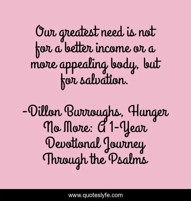 This page presents the quote "Our greatest need is not for a better income or a more appealing body, but for salvation.". Author of this quote is Dillon Burroughs, Hunger No More: A 1-Year Devotional Journey Through the Psalms. .