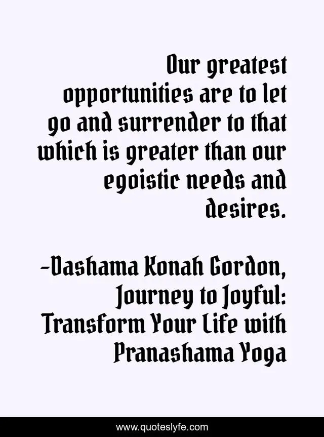 This page presents the quote "Our greatest opportunities are to let go and surrender to that which is greater than our egoistic needs and desires.". Author of this quote is Dashama Konah Gordon, Journey to Joyful: Transform Your Life with Pranashama Yoga. This quote is about love, happiness, inspirational, enthusiasm, yoga, affection,.