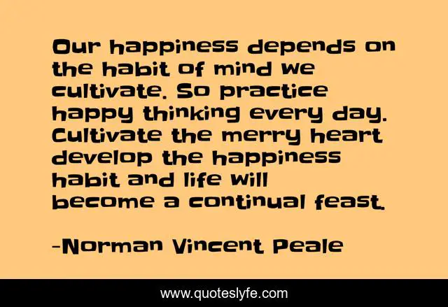This page presents the quote "Our happiness depends on the habit of mind we cultivate. So practice happy thinking every day. Cultivate the merry heart develop the happiness habit and life will become a continual feast.". Author of this quote is Norman Vincent Peale. .