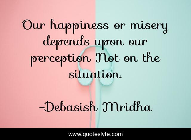 This page presents the quote "Our happiness or misery depends upon our perception Not on the situation.". Author of this quote is Debasish Mridha. This quote is about life, perception, mridha, philosophy, debasish, misery, situation, happiness,.
