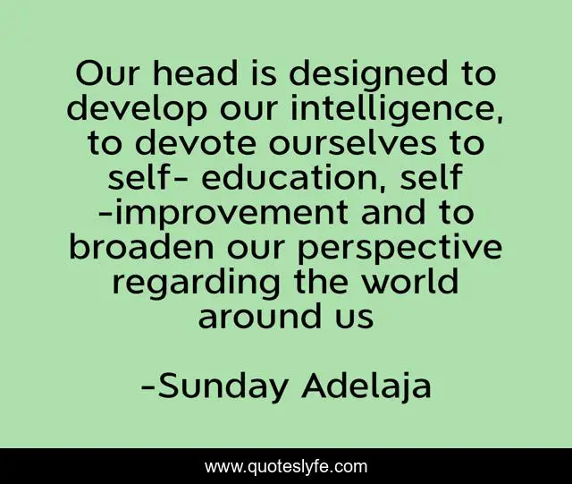 This page presents the quote "Our head is designed to develop our intelligence, to devote ourselves to self- education, self -improvement and to broaden our perspective regarding the world around us". Author of this quote is Sunday Adelaja. This quote is about development, head, intelligence, purpose, self-development, self-improvement, truth, self-education, world,.