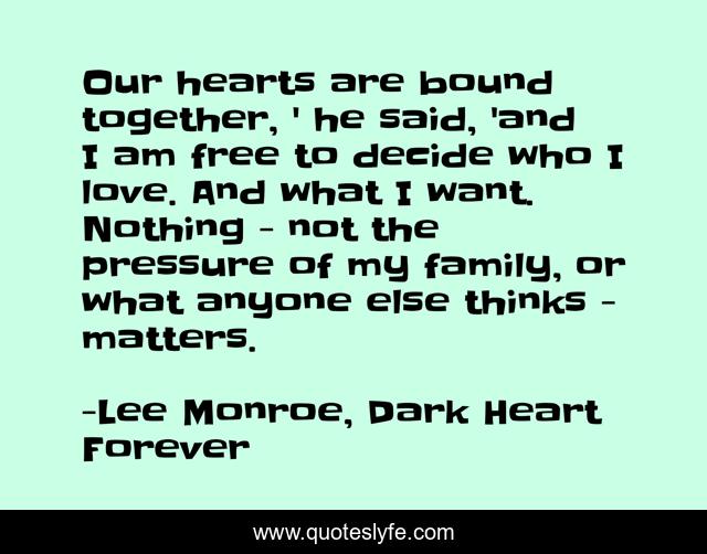 This page presents the quote "Our hearts are bound together, ' he said, 'and I am free to decide who I love. And what I want. Nothing - not the pressure of my family, or what anyone else thinks - matters.". Author of this quote is Lee Monroe, Dark Heart Forever. This quote is about romance, dark-heart-forever,.