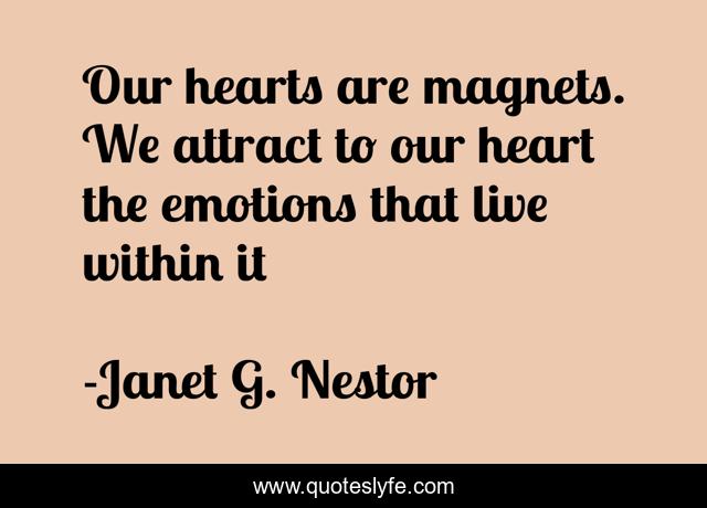 This page presents the quote "Our hearts are magnets. We attract to our heart the emotions that live within it". Author of this quote is Janet G. Nestor. This quote is about self-awareness, personal-growth, spirituality, self-help, love, affection, inspiration,.